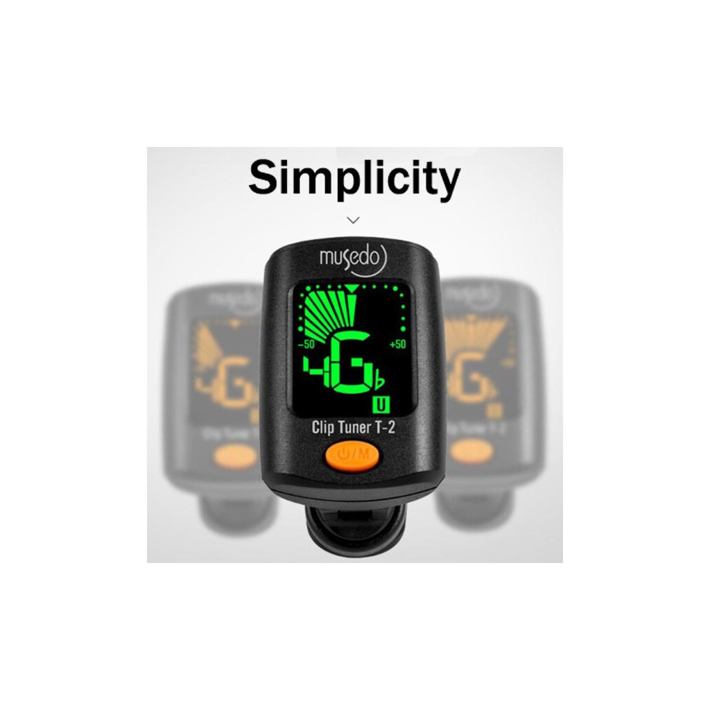 Musedo'nun bir çok müzik aletini akort edebilen, özellikle gitar ve ukulele için ergonomik boyutlara sahip T-2 modeli; 360 derece dönebilen kafası, LCD ekranı, pil ömrünü uzatan otomatik kapanma işlevi, + - 1 Cent hata ile 440Hz frekansda akort edebilme özelliğine sahiptir.