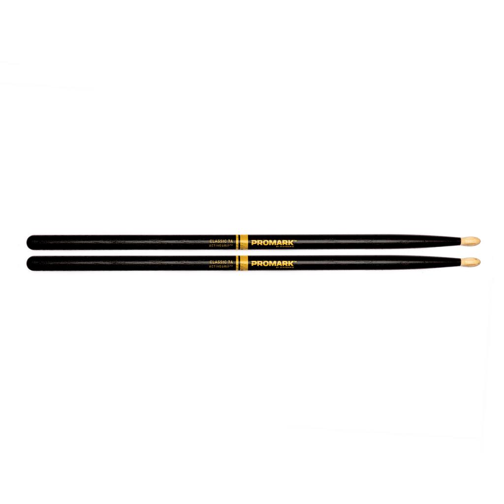 Promark's Classic 7A model with ActiveGrip finish. ActiveGrip is Promark's patented heat activated grip coating that's engineered to get tackier as a players hands sweat and their body temperature rises. It applies thin like a traditional lacquer adding no additional diameter or weight to the stick. Unlike most grip alternatives on the market ActiveGrip doesn't tear up players hands or cause restrictions to range of movement or technique.