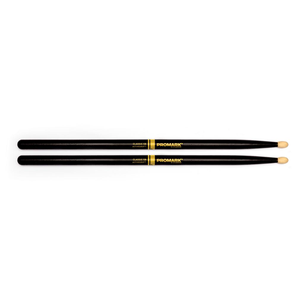 Promark's Classic 5B model with ActiveGrip finish. ActiveGrip is Promark's patented heat activated grip coating that's engineered to get tackier as a players hands sweat and their body temperature rises. It applies thin like a traditional lacquer adding no additional diameter or weight to the stick. Unlike most grip alternatives on the market ActiveGrip doesn't tear up players hands or cause restrictions to range of movement or technique.