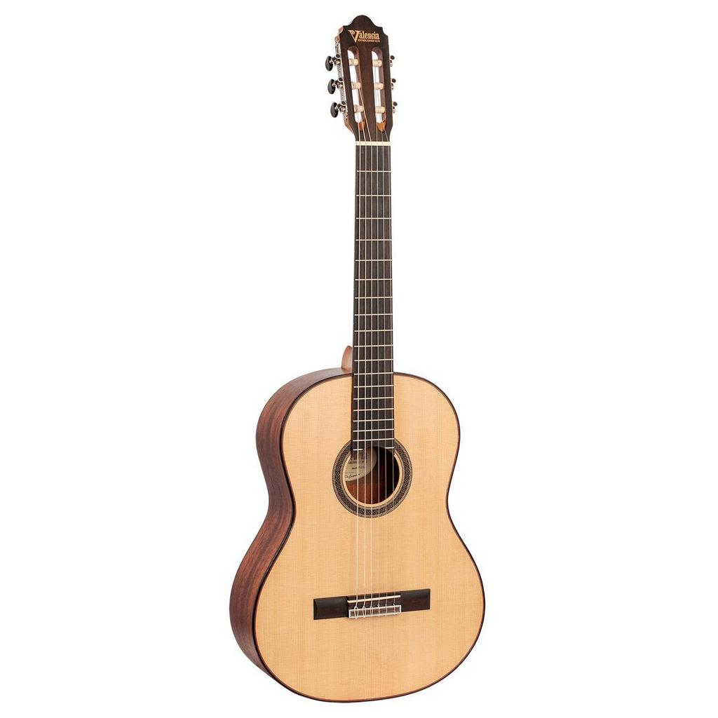 Üst: Masif Sitka Ladini Destek: ToneFlow Destek İspanyol Fan Destek Arka ve Yanlar: Premium Maun (Arka Kemerli) Üst Cilt: Gülağacı – 4 Katlı Çoklu Cilt Yan Cilt: Gülağacı – 3 Katlı Çoklu Cilt Arka Orta Şerit Gülağacı – 5 Katlı Çoklu Bağlama Mesnetli Kaplama Amara Ebony – Özel Oymalı Valencia Logolu 3 katlı Çoklu Kaplama Sap: Amara Abanoz Takviye Şeridi ile Birinci Sınıf Maun Klavye: Amara Abanoz Sap Yan Noktalar: İşlemeli Kafes Çubuğu: İki Yönlü (yalnızca 4/4 modelleri) Sap Topuğu: Amara Abanoz – 3 katlı Çoklu Kaplama Perdeler: 19 Perde; Nikel (gövdeye 12) Üst Eşik: Graph Tech NuBone Köprü: Ahşap Mozaik Süslemeli Amara Abanoz Köprü Selesi: Grafik Teknolojisi NuBone XB Rozet Süsleme: Kakma – Doğal Ahşap Mozaik Makine Kafaları: Valencia Özel Dekorasyonlu Döküm; Saten Siyah Düğmeli Nikel Kaplama Teller: ABD Tel Uzunluğu: 4/4 = 650mm (25 5/8”) Üst Eşik Genişliği: 4/4 = 52mm (2 1/16”) Yüzey: Saten